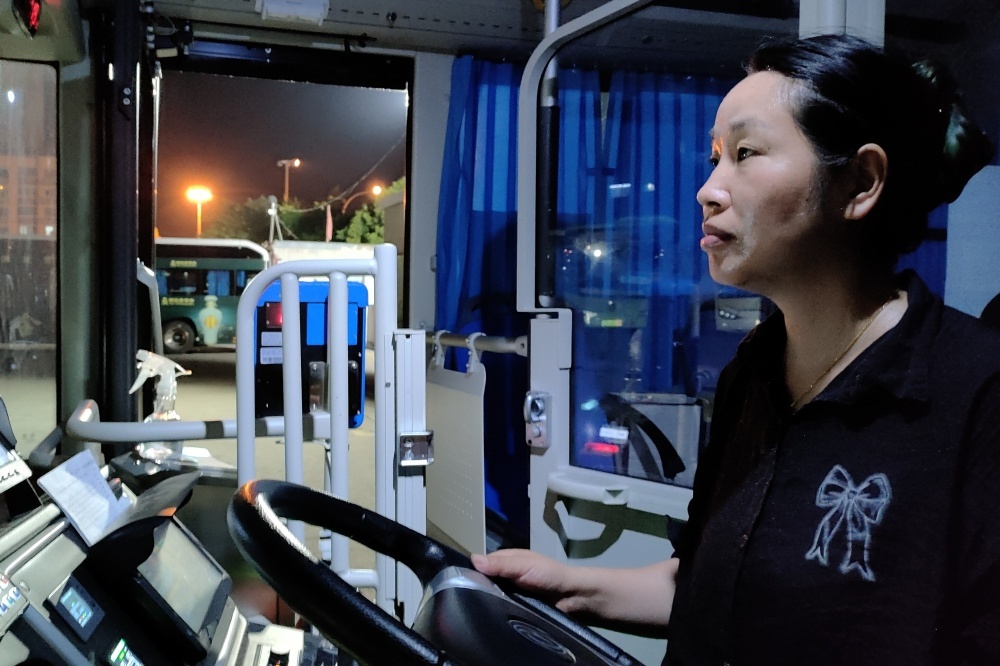 夏夜的停車(chē)場(chǎng)很是悶熱,她穿梭于公交車(chē)之間熟練地挪動(dòng)車(chē)輛,確保每輛車(chē)都能在充電低峰時(shí)段把電充滿。