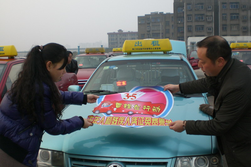 昨日7時(shí)30分,市出租汽車公司雷鋒車隊(duì)的20臺(tái)雷鋒車和20臺(tái)優(yōu)秀出租汽車匯集到泉口一路市出租汽車公司院內(nèi),統(tǒng)一粘貼心形的"3-5雷鋒在行動(dòng)""老年人和殘疾人免費(fèi)乘坐"活動(dòng)標(biāo)識(shí)(如圖),經(jīng)過簡短的啟動(dòng)儀式后,駕駛員們整裝出發(fā),在城區(qū)運(yùn)行,對(duì)老年人、殘疾人和到醫(yī)院就醫(yī)但行動(dòng)不便的病人實(shí)行免費(fèi)接送服務(wù)。