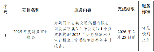 二、項(xiàng)目名稱:荊門(mén)市公共交通集團(tuán)有限公司2025年度財(cái)務(wù)審計(jì)服務(wù)項(xiàng)目