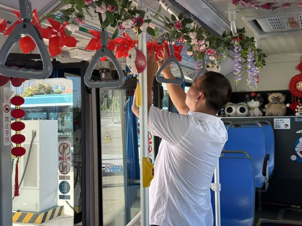 張峻峰是荊門公交2024年度“最美公交人”,他的車上總比別人多點(diǎn)“暖心”東西:駕駛座旁的小盒子里備著暈車藥、創(chuàng)可貼和折疊傘?!敖衲陣鴳c,就想乘客上車能樂呵樂呵。”于是張峻峰就動(dòng)了裝飾車廂的念頭。他自費(fèi)買了小國旗、風(fēng)車、燈籠等裝飾,晚上在家剪剪貼貼,白天利用休息時(shí)間在車上裝飾。張峻峰的行動(dòng),也是荊門公交服務(wù)提升的一個(gè)縮影。