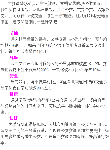 此外,在"公交出行宣傳周"到來(lái)之際,荊門公交集團(tuán)公司呼吁廣大車主,請(qǐng)遵守交通規(guī)則,尤其在上下班高峰期時(shí)不要隨意駛?cè)牍粚S玫馈?/p>