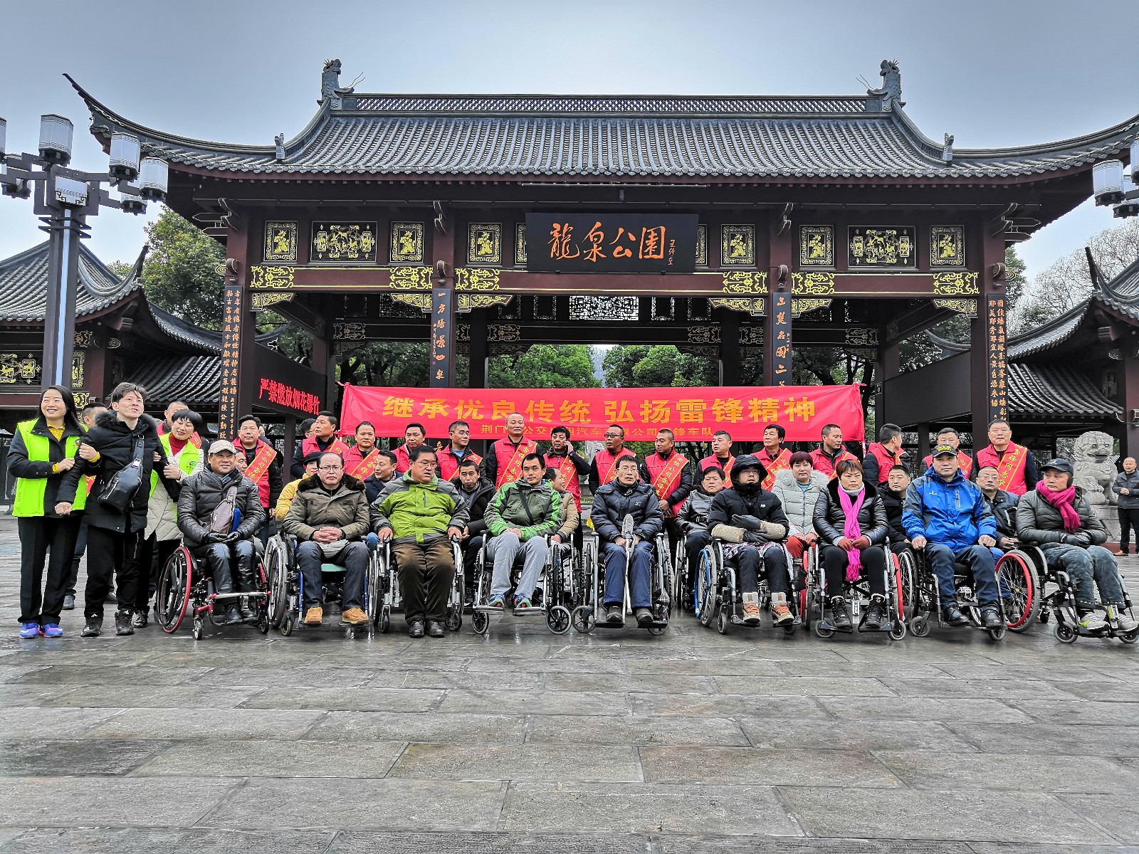 10時,車隊到達(dá)龍泉公園,在新修建的公園門口殘疾朋友集中合影留念,在公交黨支部的帶領(lǐng)下共同宣讀入黨誓詞,唱雷鋒歌。在融洽歡樂的氛圍下開始了游園之行。
