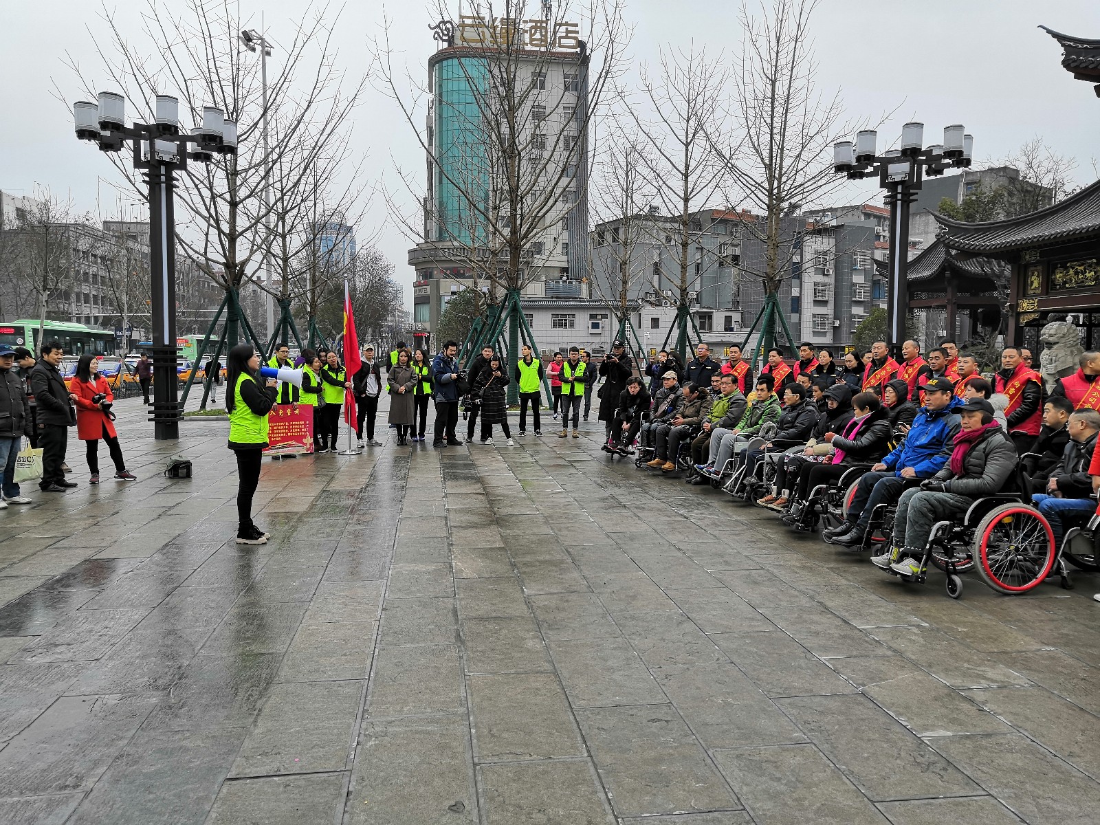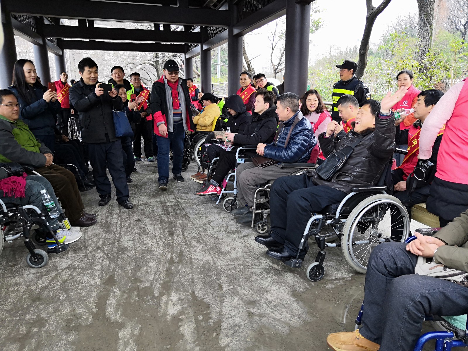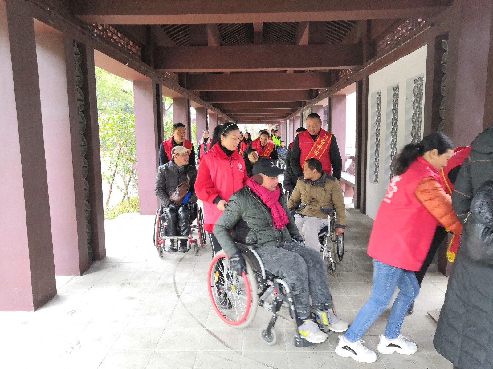 龍泉公園長廊,在公園導(dǎo)游的介紹下,殘疾朋友及隨行的志愿者們更清楚的知道了龍泉公園的建園歷史和荊門故事。