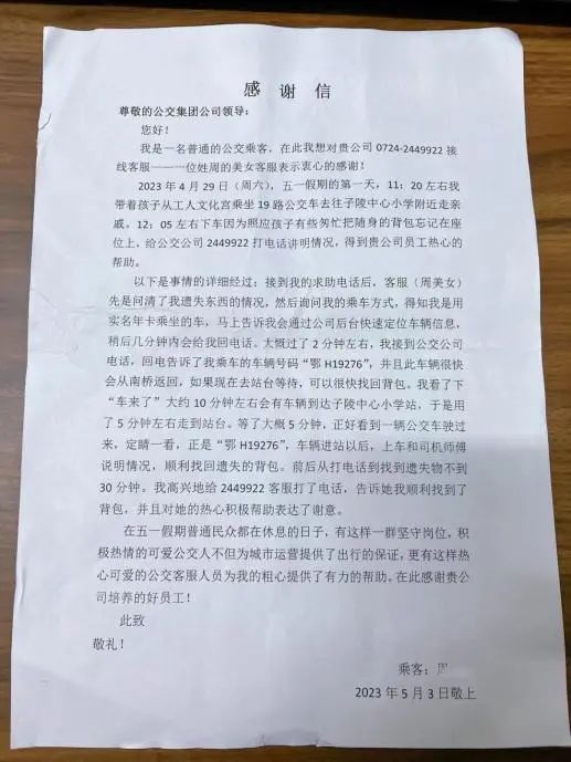 5月4日,小雨,一位熱心乘客走進(jìn)了荊門市公共交通集團(tuán)有限公司客服中心,送來一封溫暖的感謝信。信中,她向“五一”節(jié)假日期間堅(jiān)守崗位、積極熱心的公交人表達(dá)了濃濃謝意,紙短情長(zhǎng),字里行間流露出款款真情。