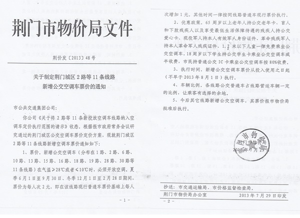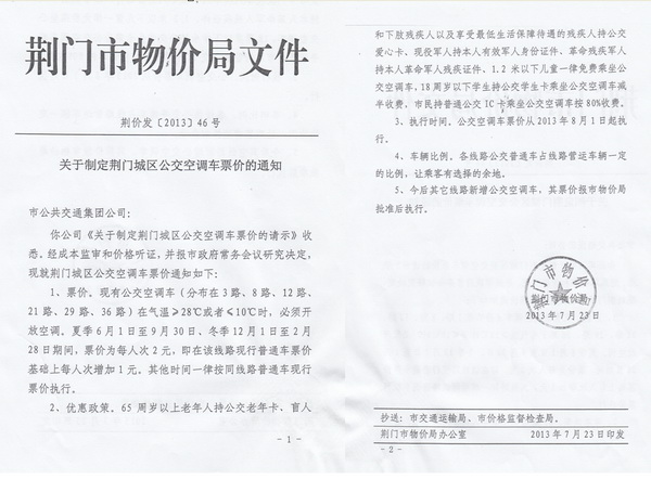 根據(jù)荊門(mén)市物價(jià)局《關(guān)于制定荊門(mén)城區(qū)公交空調(diào)車(chē)票價(jià)的通知》(荊價(jià)發(fā)[2013]46號(hào))及《關(guān)于制定荊門(mén)城區(qū)2路等11條線路新增公交空調(diào)車(chē)票價(jià)的通知》(荊價(jià)發(fā)[2013]48號(hào)),公交空調(diào)車(chē)2014年6月1日至9月30日營(yíng)運(yùn)時(shí)段內(nèi)執(zhí)行2元/人次票價(jià),現(xiàn)就執(zhí)行公交空調(diào)車(chē)票價(jià)后的有關(guān)事項(xiàng)公告如下: